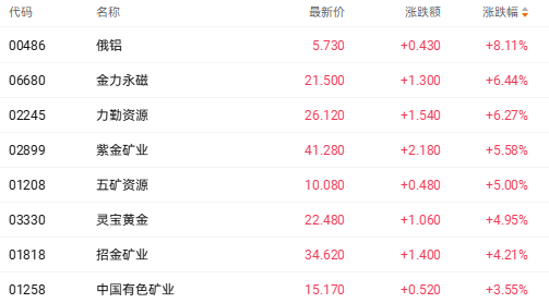 同样受益国际金价走强,有色金属股也出现上涨。截至收盘,俄铝(00486.HK)涨8.11%、金力永磁(06680.HK)涨6.44%、力勤资源(02245.HK)涨6.27%。