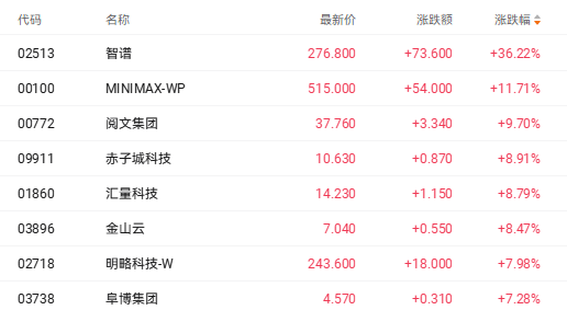 截至收盘,智谱(02513.HK)涨36.22%、MINIMAX-WP(00100.HK)涨11.71%、汇量科技(01860.HK)涨8.79%。