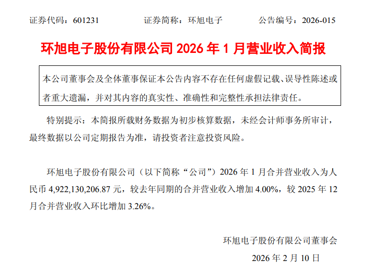2月9日,环旭电子(601231.SH)发布了2026年1月营业收入简报。根据公告,公司2026年1月合并营业收入为人民币4,922,130,206.87元,较去年同期的合并营业收入增加4.00%,较2025年12月合并营业收入环比增加3.26%。