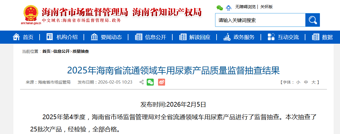 2025年第4季度,海南省市场监督管理局对全省流通领域车用尿素产品进行了监督抽查。本次抽查了25批次产品,经检验,全部合格。