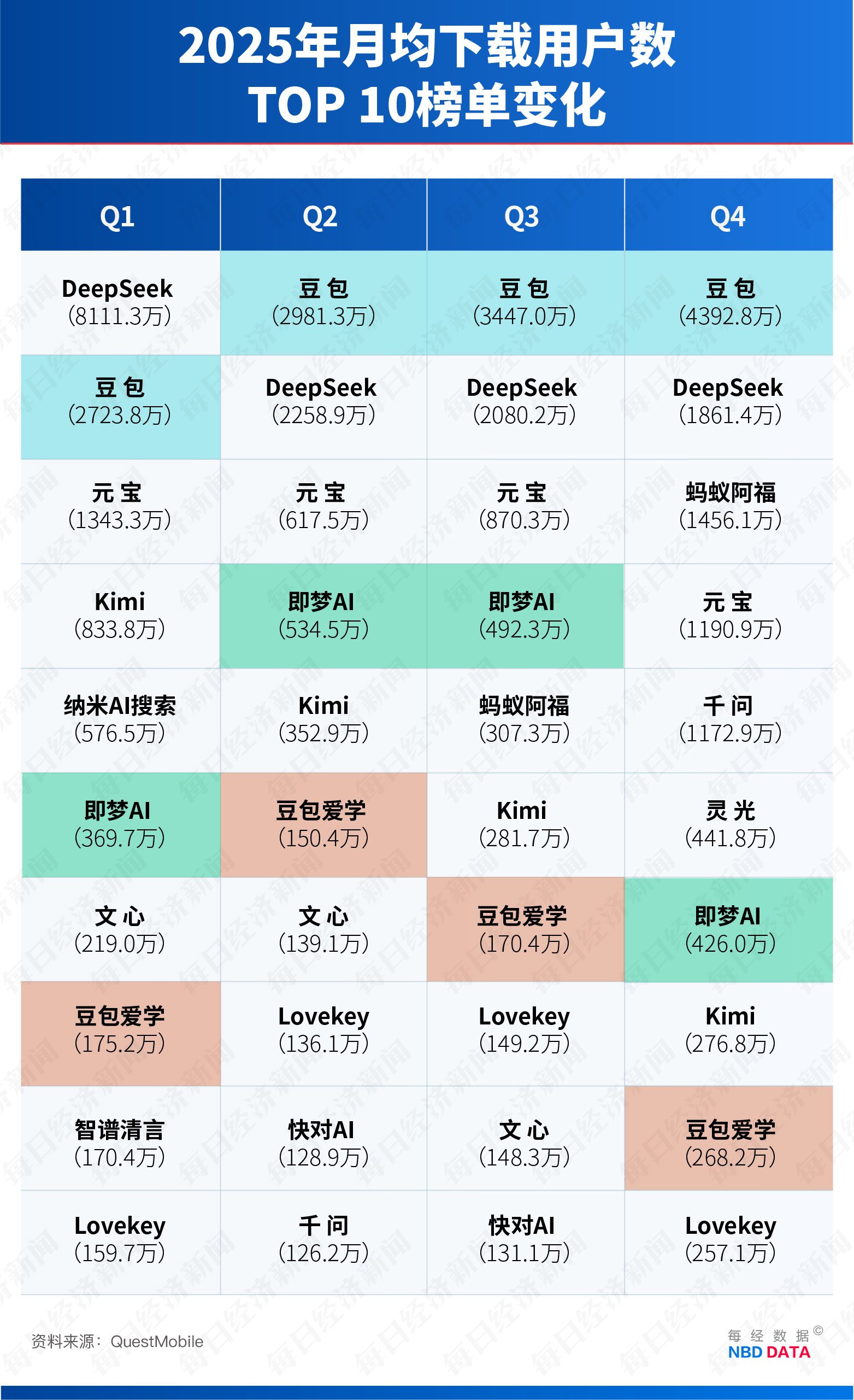 下载量数据同样亮眼。2025年第二季度至第四季度,豆包App在月均下载量上一直稳居第一。到第四季度时,其月均下载量甚至较DeepSeek高出135%。