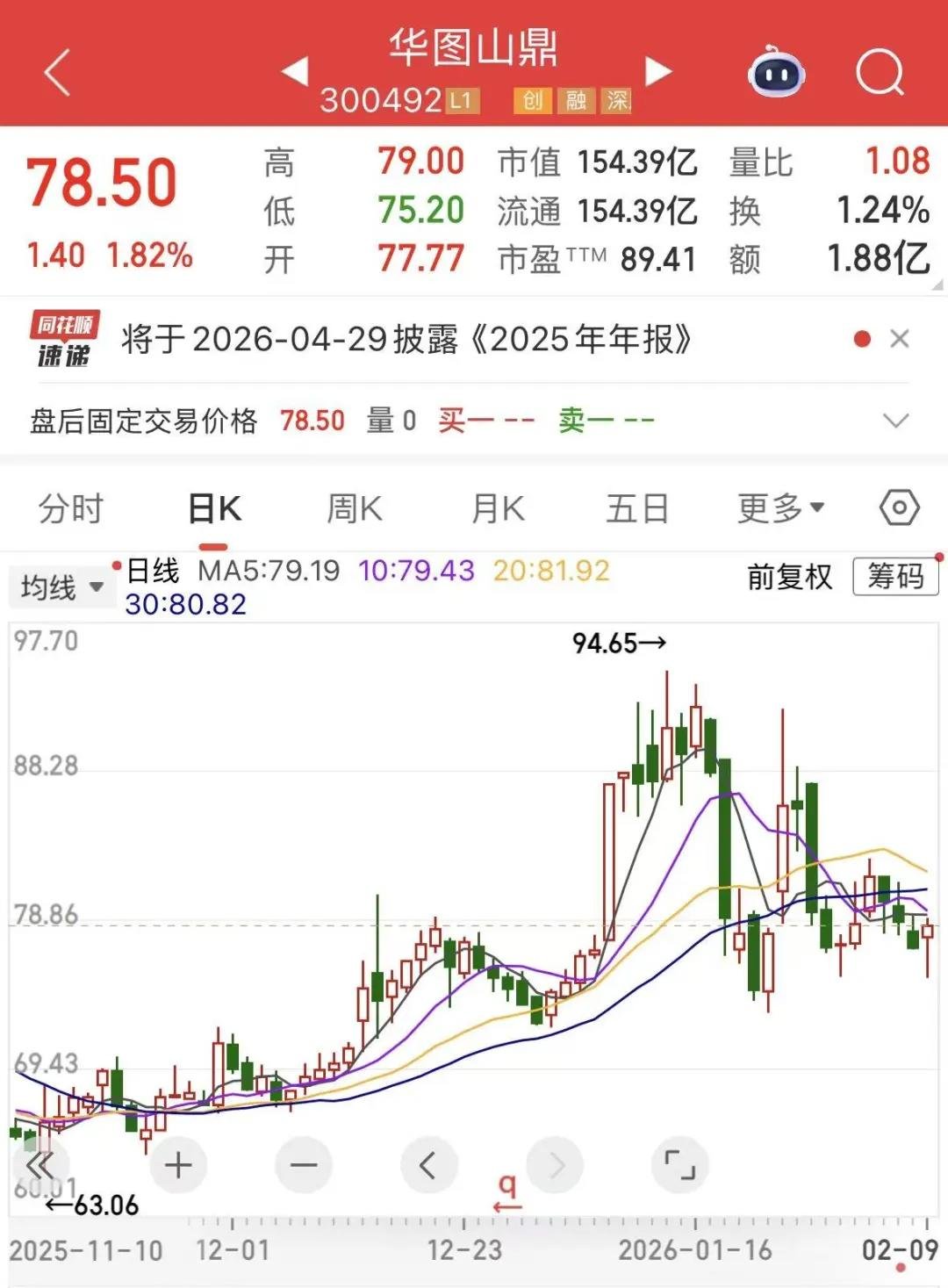 二级市场方面,截至2月9日收盘,华图山鼎报78.5元/股,总市值154.4亿元。