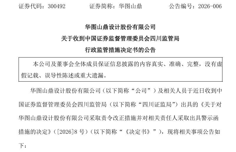 近日,华图山鼎设计股份有限公司(证券简称:华图山鼎)发布公告,公司近日收到四川证监局出具的《关于对华图山鼎设计股份有限公司采取责令改正措施并对相关责任人采取出具警示函措施的决定》。