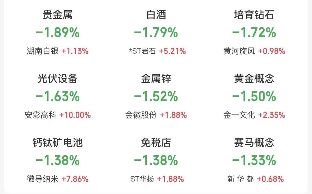 贵金属、白酒、培育钻石、光伏设备、金属锌、黄金概念、钙钛矿电池、免税店、赛马概念等板块跌幅靠前。