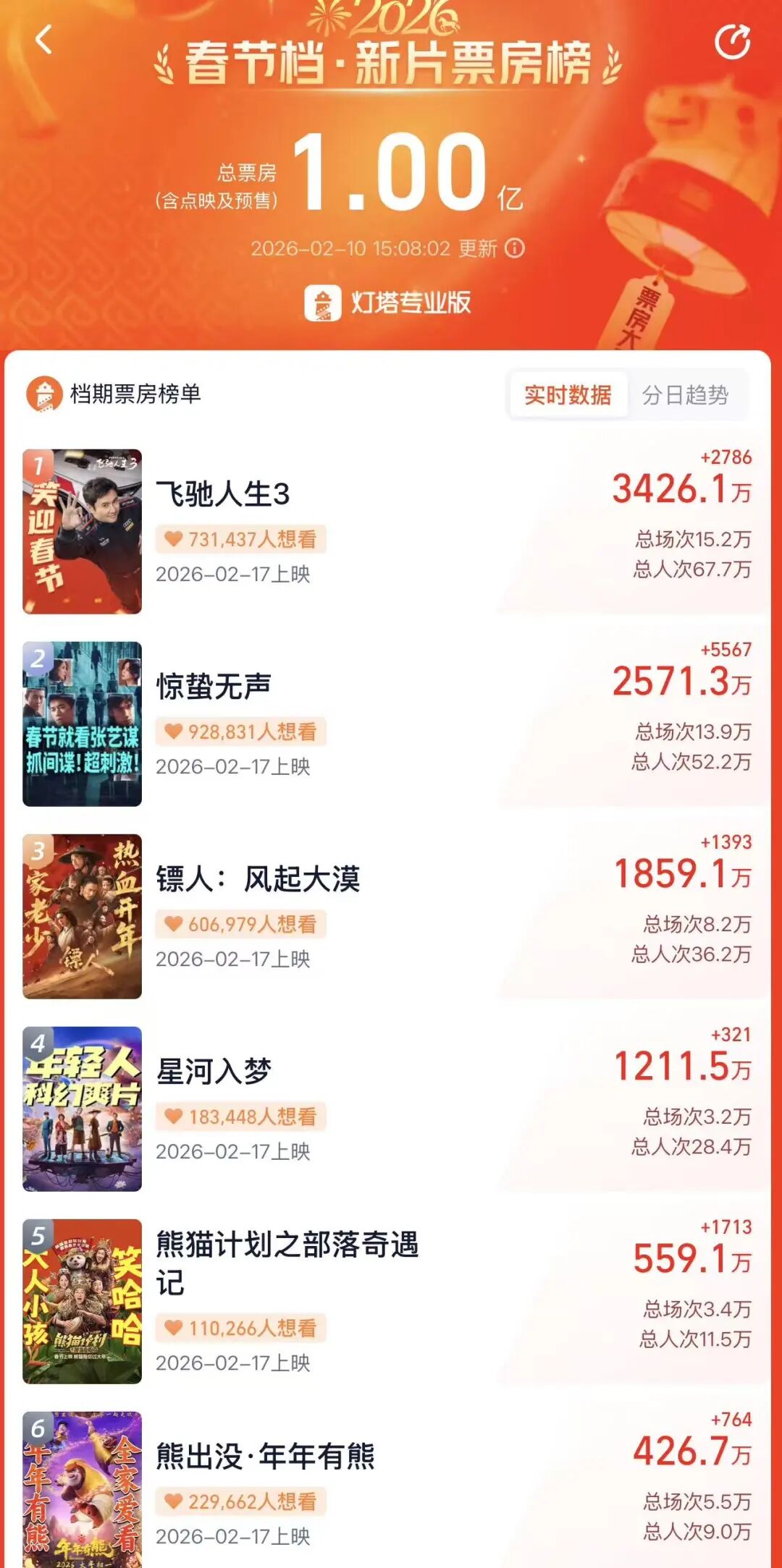 影视院线领域,灯塔专业版数据显示,截至发稿,2026年春节档新片预售票房已突破1亿元,其中《飞驰人生3》超3400万元,《惊蛰无声》超2500万元。