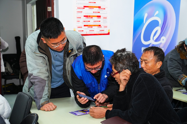 在蓝马甲志愿者的帮助下,村医们认真学习如何使用蚂蚁阿福app。