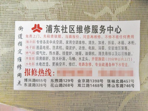 那张小卡片上还有更多疑点,表面印制粗糙,罗列的维修项目却包罗万象,简直是“万能公司”。卡片上没有留下任何公司的名称,只写着“浦东社区维修服务中心”“街道指定维修网点”等表述含糊的名称。浦东新区现辖12个街道、24个镇,其中并无“浦东社区”。记者联系了曹老伯家所在的金杨新村街道和银山路第一居委会,工作人员反馈,街道及居委从未印制或发放过任何“街道指定维修网点”宣传卡片,也没有授权任何企业使用街道名义开展维修服务。