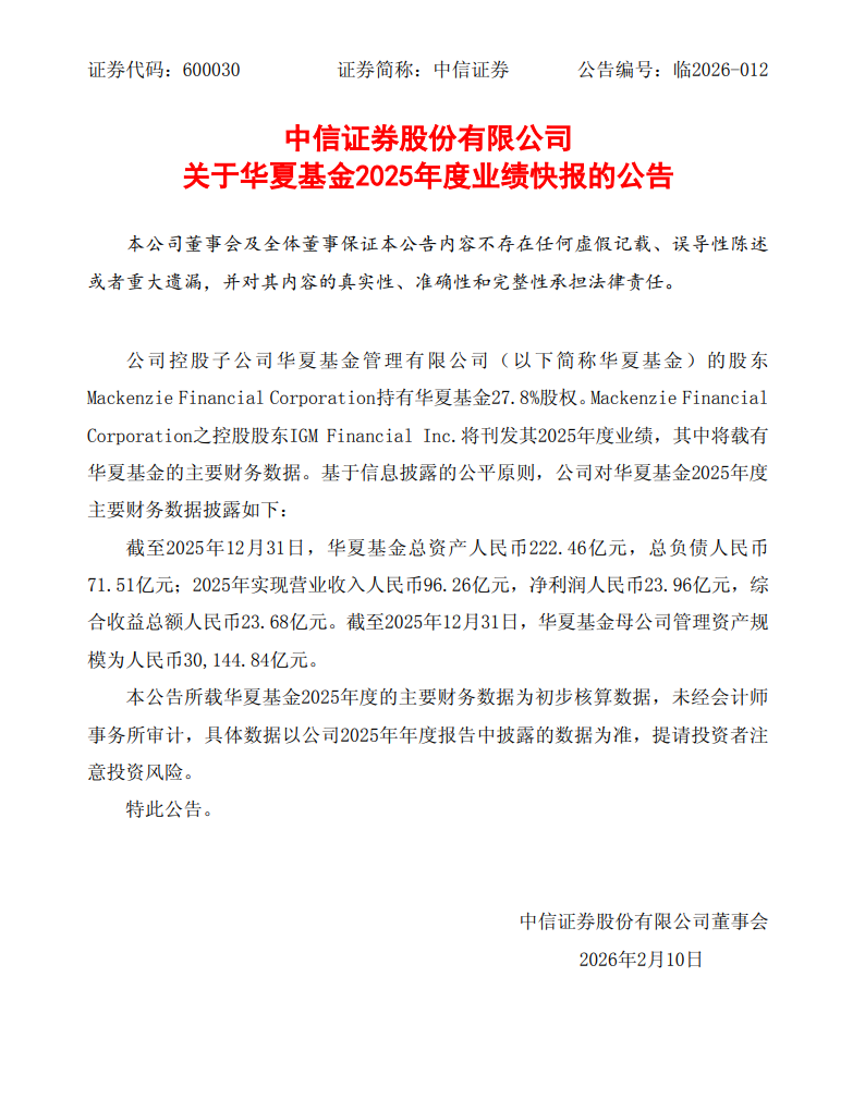 2月10日,中信证券(600030.SH)披露华夏基金2025年度业绩快报。数据显示,华夏基金2025年实现营业收入96.26亿元,净利润23.96亿元,综合收益总额23.68亿元。截至2025年12月31日,华夏基金总资产222.46亿元,总负债71.51亿元,母公司管理资产规模为30,144.84亿元。