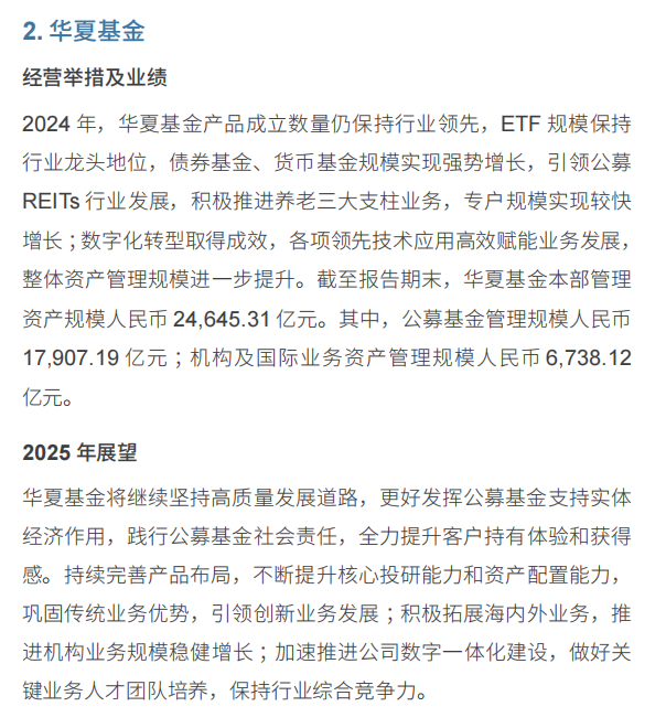 中信证券2024年年度报告显示,截至2024年末,华夏基金本部管理资产规模人民币 24,645.31 亿元。其中,公募基金管理规模人民币17,907.19 亿元 ;机构及国际业务资产管理规模人民币 6,738.12亿元。
