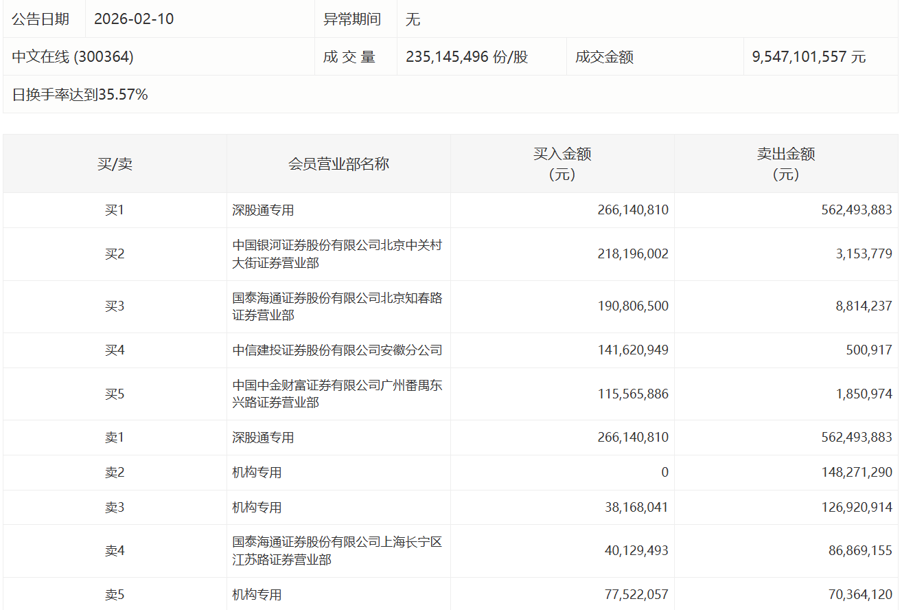 人民财讯2月10日电,中文在线今日20%涨停,成交额95.47亿元,换手率35.61%。盘后龙虎榜数据显示,深股通专用席位买入2.66亿元并卖出5.62亿元,1家机构专用席位净买入715.79万元,2家机构专用席位净卖出2.37亿元。