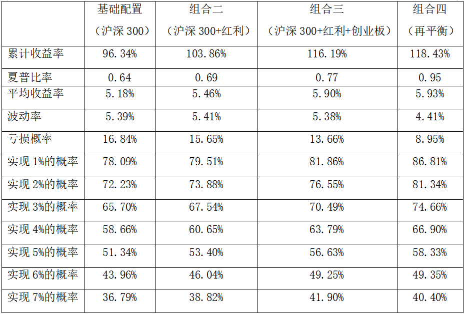 加入创业板配置的组合三,组合配置80%中债-企业债AAA财富(1-3年)指数,10%沪深300全收益指数,5%中证红利全收益指数,5%创业板全收益指数。该组合期间累计收益率116.19%,年化平均收益率5.90%,年化波动率5.38%,夏普比率0.77。可以看到,加入创业板资产后,相较组合一、组合二,组合三的亏损概率、各绝对收益目标的达成概率及风险收益特征进一步改善。