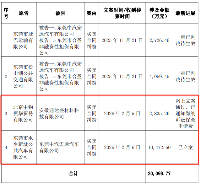 其中,2月6日,东莞市水乡新城公共汽车有限公司向中汽宏远提起诉讼,涉案金额1.05亿元,法院已立案。