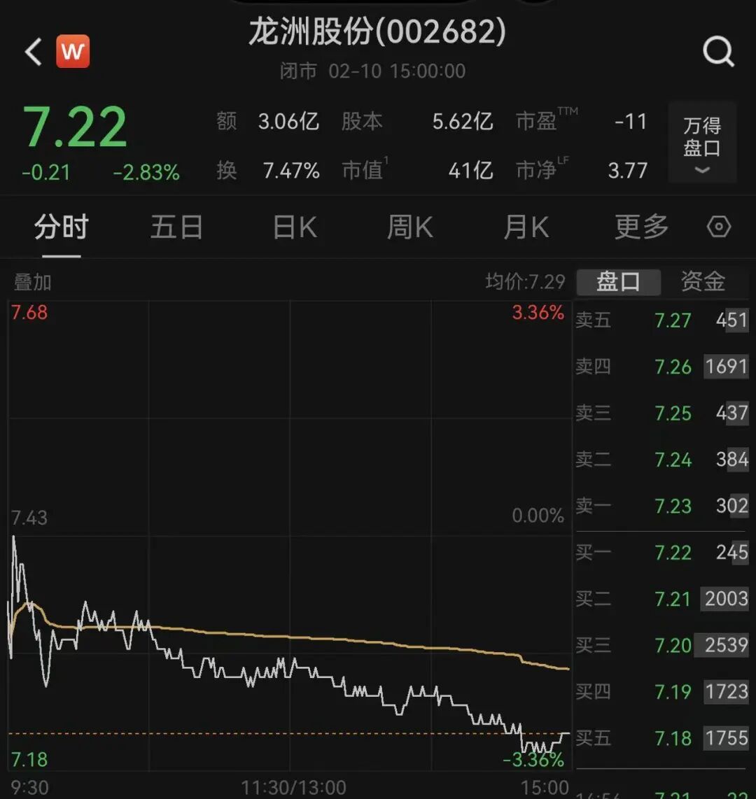 二级市场上,截至2月10日收盘,龙洲股份跌2.83%,报7.22元/股,总市值约41亿元。