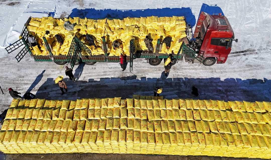 2月10日,黑龙江北大荒集团格球山农场有限公司第一管理区,工人在卸储肥料。