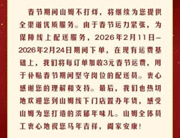 山姆发布春节运费说明称,由于春节运力紧张,为保障线上配送服务,2月11日至2月24日期间下单线上配送,将在现有运费的基础上每单加收3元春节运费,用于补贴春节期间坚守岗位的配送员。