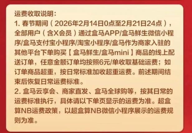 盒马发布通知称,自2月14日0时至2月21日24时期间,全部用户通过线上平台配送订单,任意金额订单均按照每单6元收取基础运费;如订单商品超重,按日常标准加收超重运费。