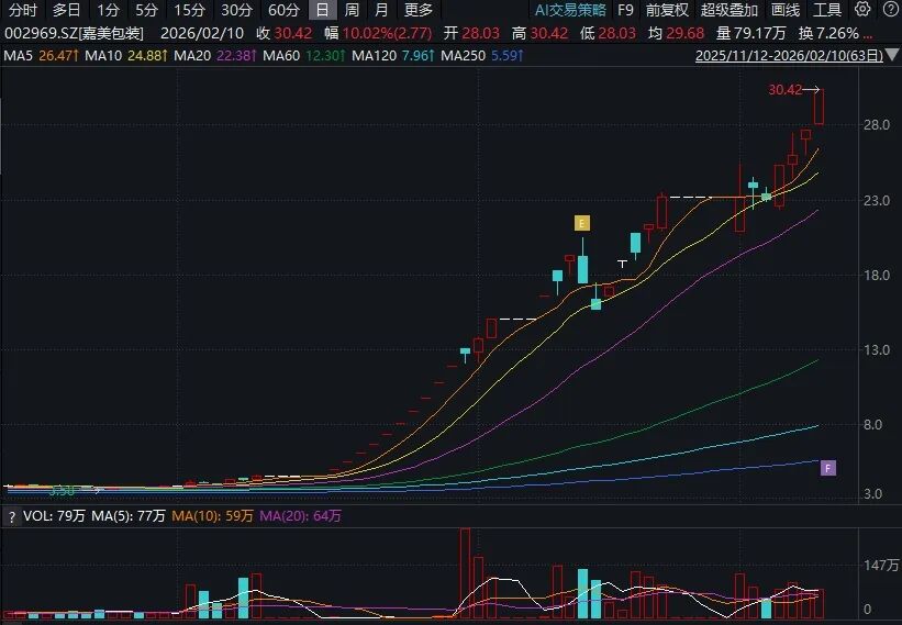 2月10日,嘉美包装(002969)再度涨停。自2025年12月17日以来,公司股价涨幅已高达567.11%,最新报收30.42元/股,市值334亿元。