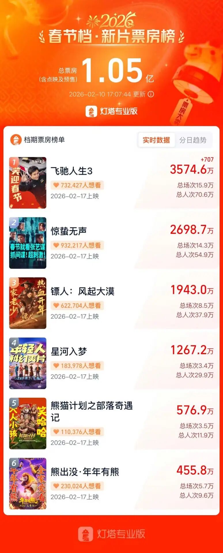 据灯塔专业版,截至2月10日下午5点,2026春节档新片电影总票房(含预售)已突破1亿元,达1.05亿元。《飞驰人生3》《惊蛰无声》《镖人》《熊出没・年年有熊》《星河入梦》《熊猫计划之部落奇遇记》等影片位居春节档票房前列。