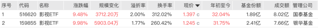 跟踪中证影视指数的ETF共有2只。其中,银华影视ETF(159855)触及涨停,收涨9.98%,最新基金规模超过3亿元,近期资金流入明显,管理费和托管费分别为0.5%和0.1%。另一只国泰影视ETF(516620)日涨幅9.48%,最新基金规模2.64亿元,管理费和托管费分别为0.5%和0.1%。