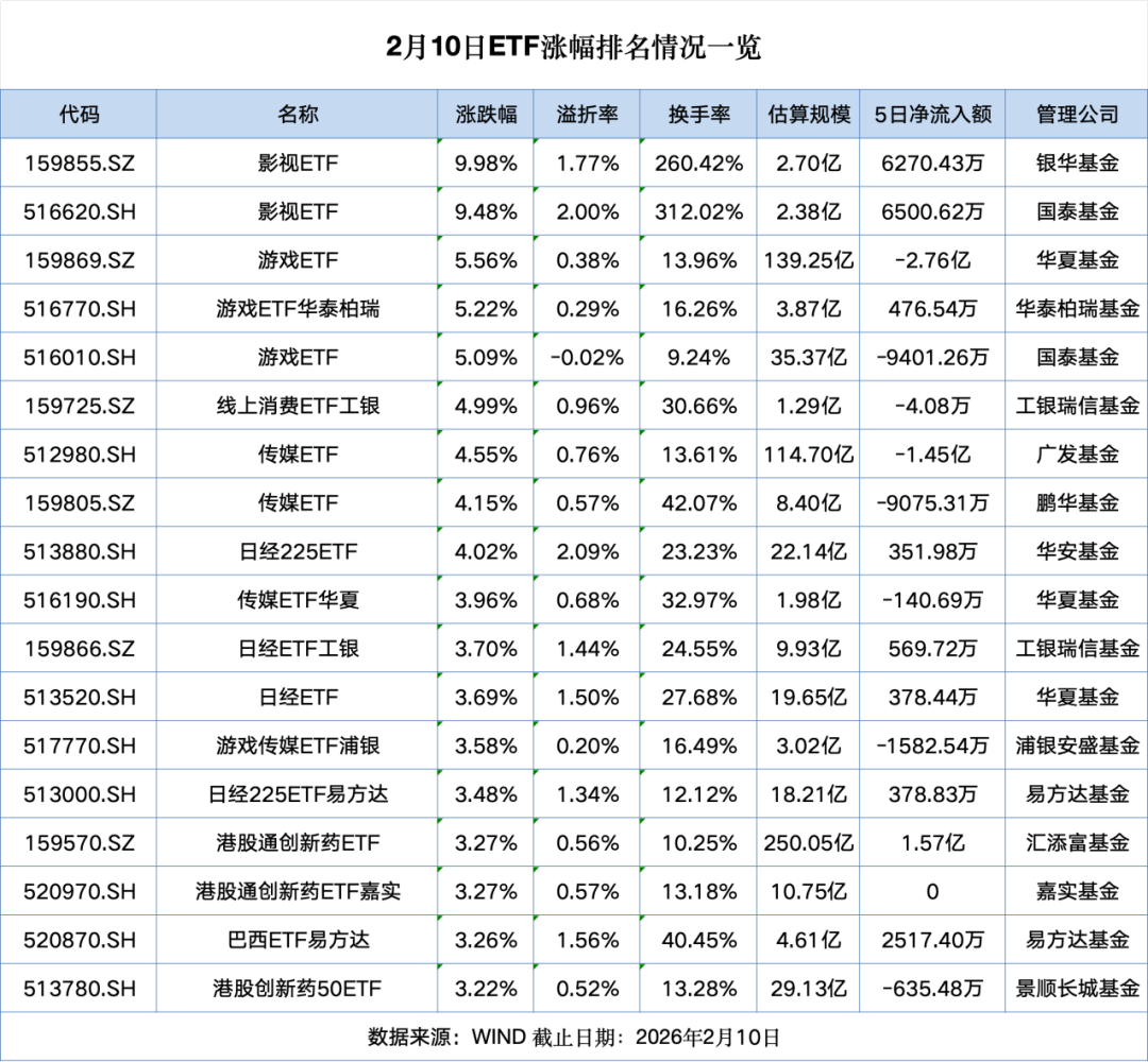 大家好,这里是ETF洞察。今天是2026年2月10日星期二,A股三大指数涨跌互现,AI应用、影视板块掀“涨停潮”,光伏、地产、大消费板块走弱。