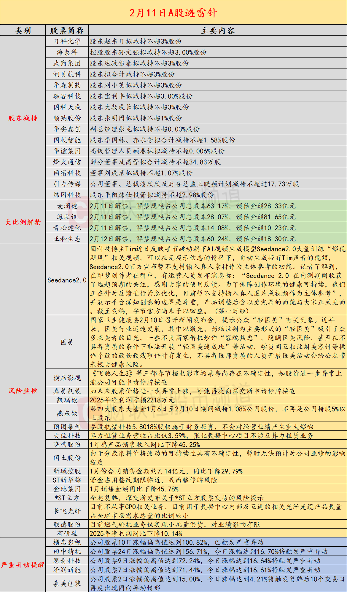 导读:财联社2月11日投资避雷针,近日,A股及海外市场潜在风险事件如下。国内经济信息方面包括:1)MSCI中国指数调整,剔除复星国际、长城汽车等16只股票;2)Seedance 2.0官方暂停真人素材相关功能;公司方面重点关注包括:1)9天7板横店影视公告,《飞驰人生3》等三部春节档电影市场票房尚存在不确定性,如股价进一步异常上涨公司可能申请停牌核查;2)4天2板嘉美包装表示,如未来股票价格进一步异常上涨,可能再次向深交所申请停牌核查;海外市场重点关注包括:1)美股三大指数收盘涨跌不一,存储、加密货币概念股跌幅居前;2)特朗普称若美伊谈判失败,或向中东再派一支航母打击群。