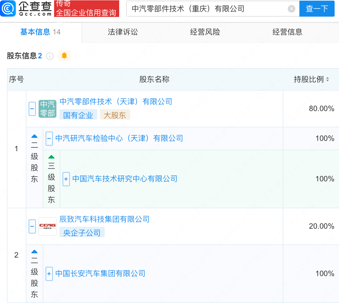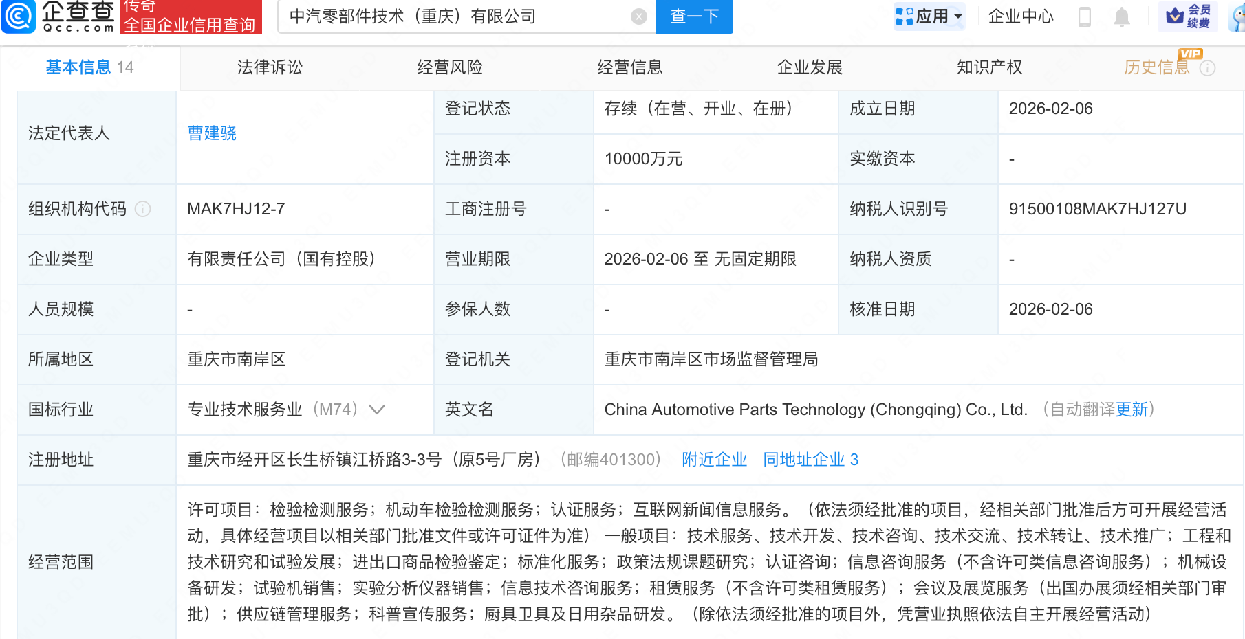 企查查APP显示,近日,中汽零部件技术(重庆)有限公司成立,注册资本1亿元,经营范围包含:检验检测服务;机动车检验检测服务;认证服务;互联网新闻信息服务等。企查查股权穿透显示,该公司由中国汽车技术研究中心有限公司旗下中汽零部件技术(天津)有限公司、中国长安汽车集团有限公司旗下辰致汽车科技集团有限公司共同持股。