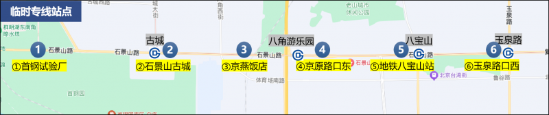 公交临时专线覆盖首钢园、地铁古城站、石景山游乐园、地铁八角游乐园站、地铁八宝山站及地铁玉泉路站等重点区域和轨道站点,在临时封站停运期间,全力保障沿线市民快速接驳地铁1号线玉泉路站。