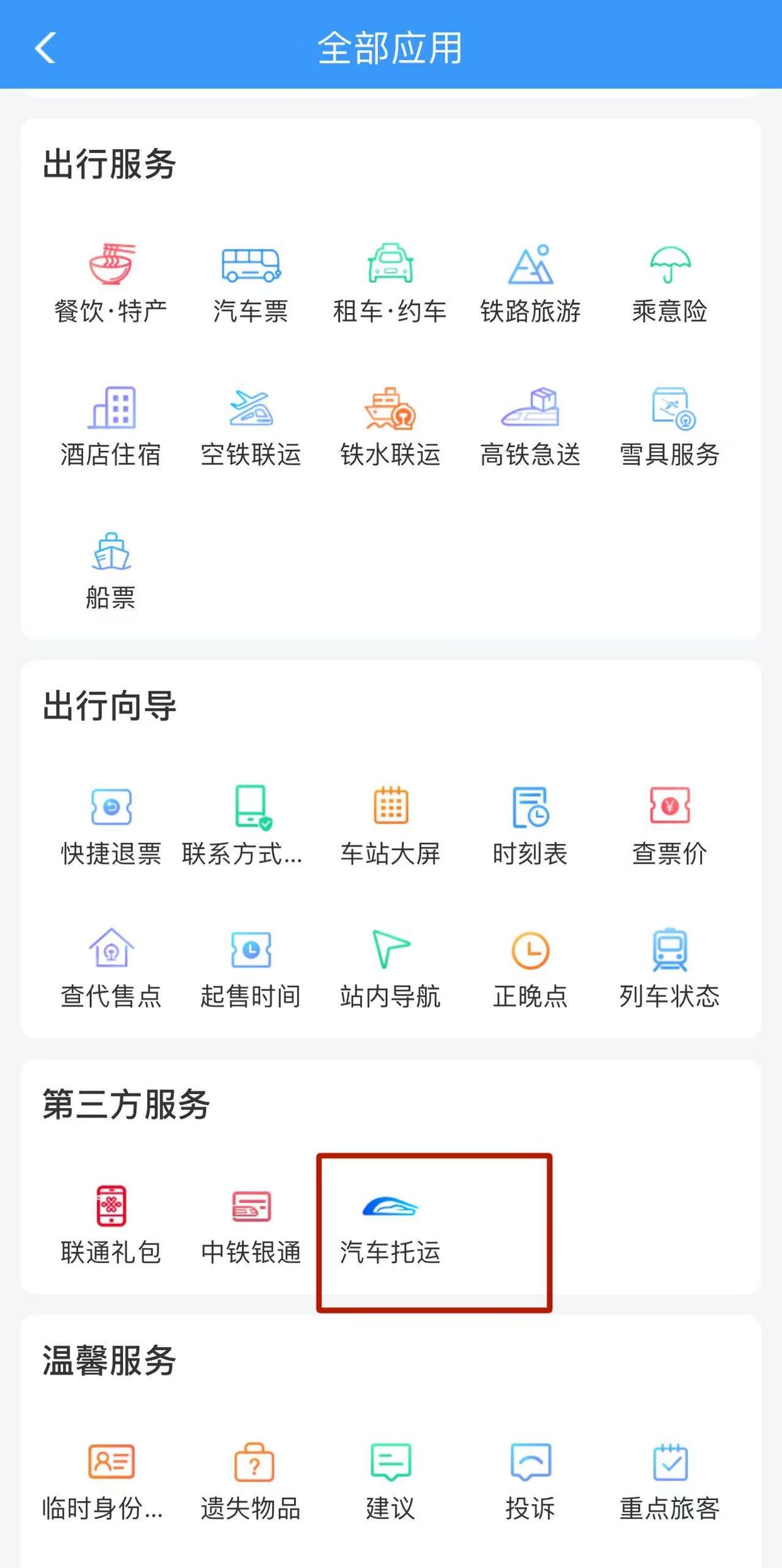 12306App上“全部应用”中的“汽车托运”服务入口。 中铁特货广州分公司安全员廖泽龙告诉记者,公司会依据标准清单,对每辆托运的汽车进行全方位检查,核对型号、车架号、外观划痕,经过驾驶装载、加固锁定、终检与封签等程序,完成装车流程。