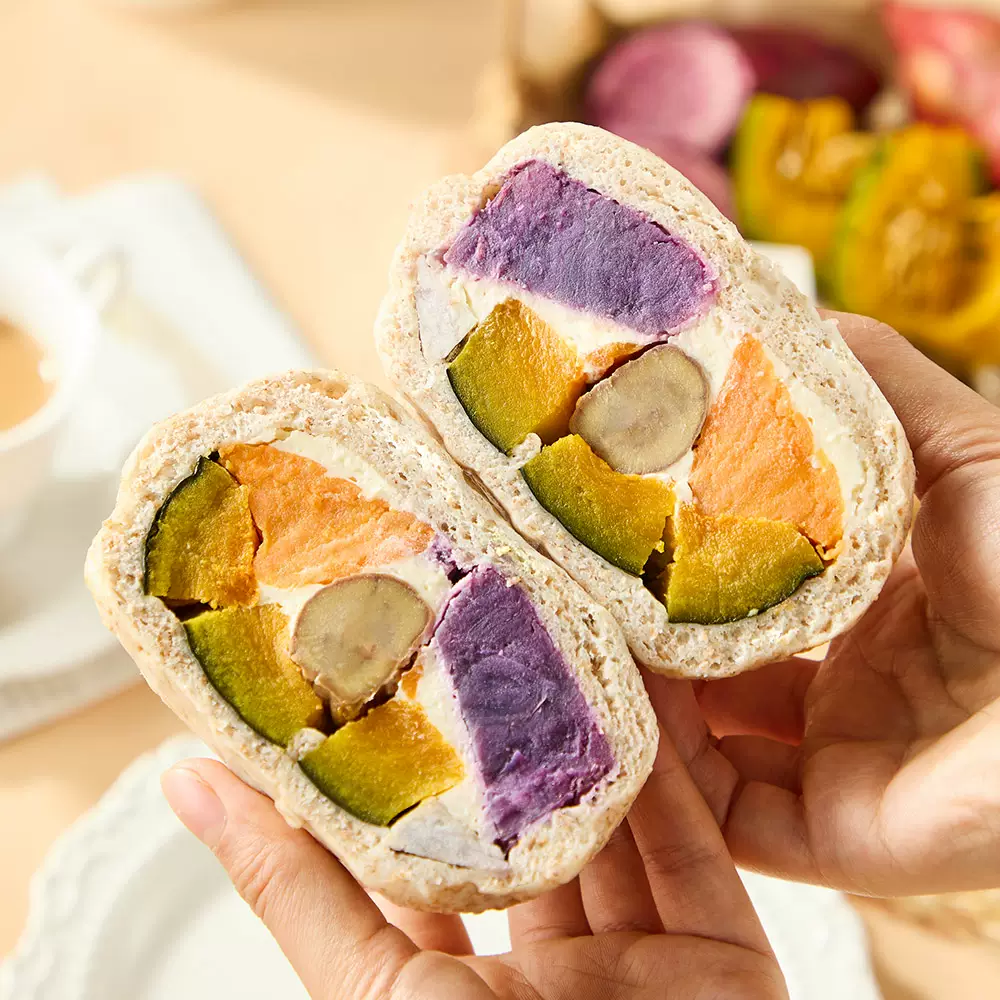 它不是那种白白胖胖、安安静静的传统馒头,而是把紫薯、板栗、坚果、芝士紧紧塞进去,最大的亮点是——切半卖,截面像一块彩色地层,层层分明。“高纤维”“低负担”“蒸制更健康”,这些词,开始贴在馒头身上。