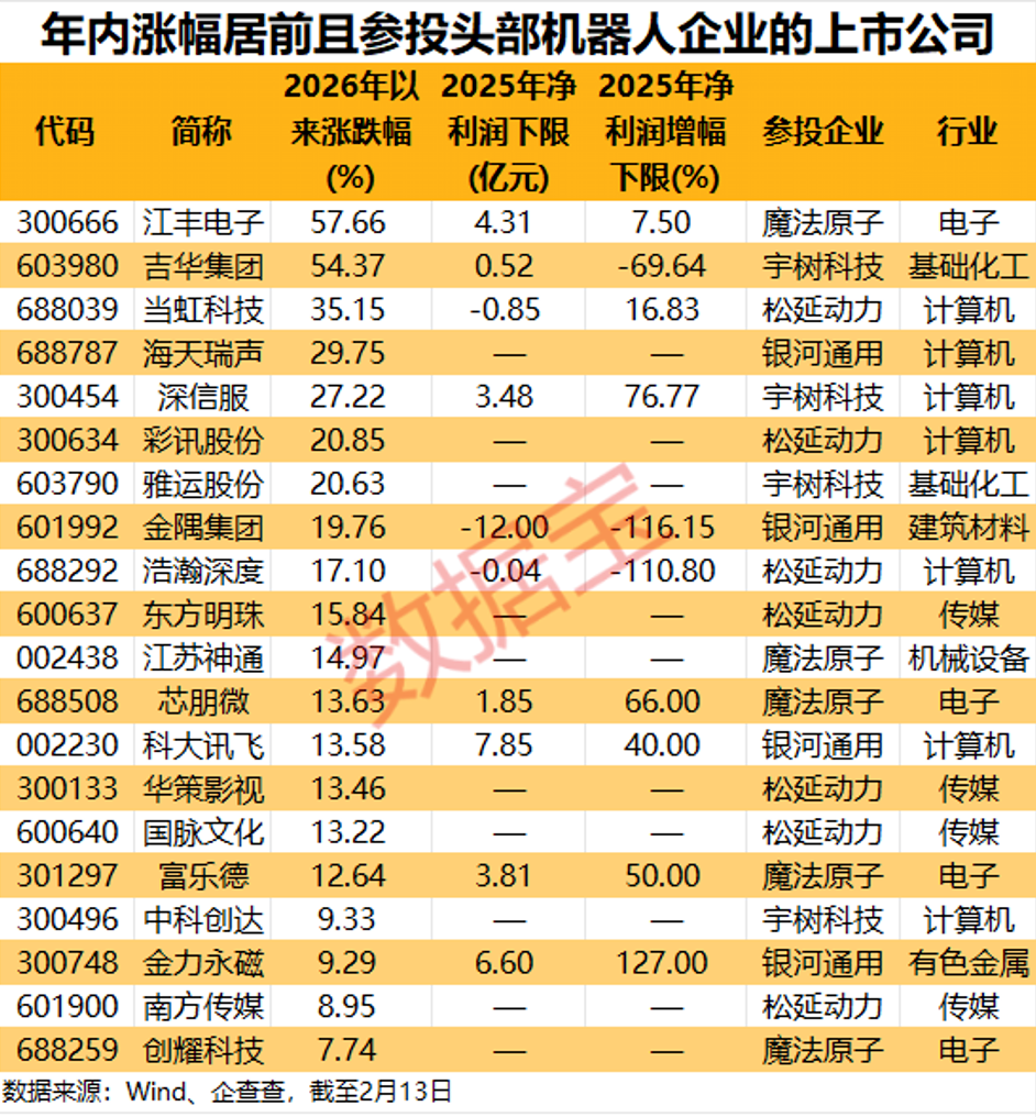 投资上述4家企业的还有一批上市公司。根据股权穿透信息不完全统计,直接或间接投资宇树科技、松延动力、魔法原子及银河通用的A股上市公司有52家,覆盖计算机、电子、传媒、机械设备等15个行业,其中吉华集团同时间接投资了宇树科技及银河通用,中际旭创同时间接投资了宇树科技及魔法原子。