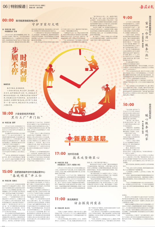 二月的江淮大地,陌上花开,生机盎然。2月24日,春节假期后开工第一天,本报派出多路记者分赴基层一线,用脚步追寻奋斗者的身影,用笔触记录实干者的印迹。我们在深夜里见证坚守,在朝晖中看见出发,在日影下丈量进步——每一滴汗水,都在为这片热土的春天注入蓬勃力量。