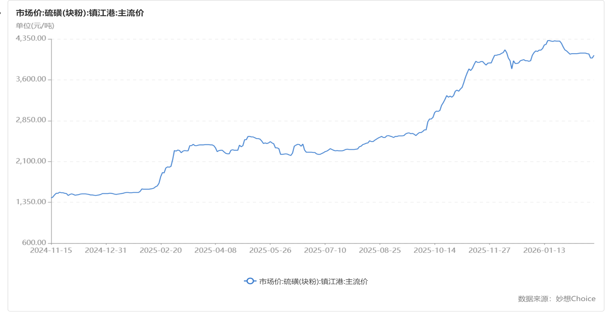 截至2月28日,镇江港硫磺(粉块)主流市场价格约4050元/吨,与年初价格持平,较2025年同期的2010元/吨涨幅超过100%。