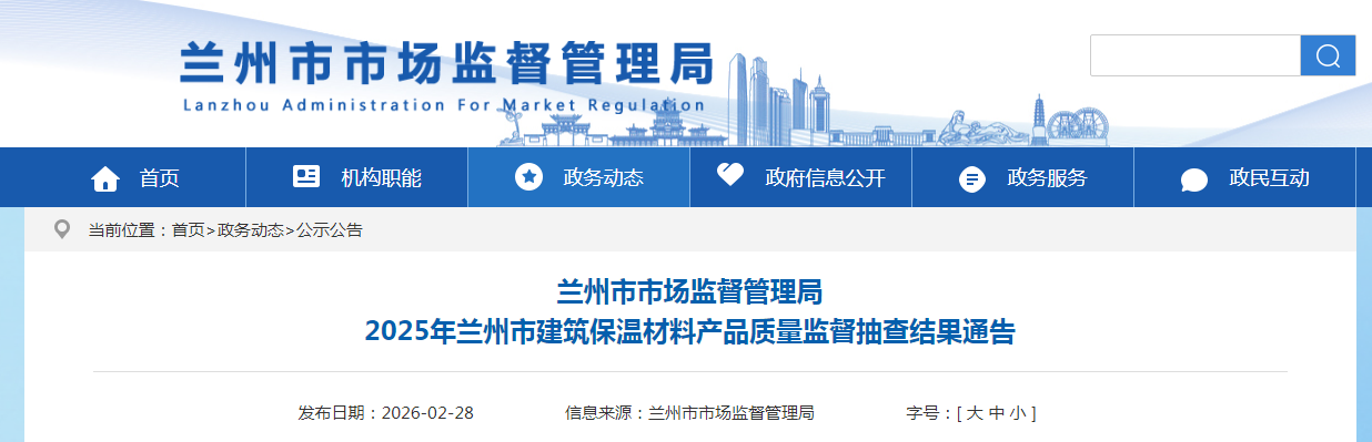 中国质量新闻网讯 据兰州市市场监督管理局网站消息,为强化建筑保温材料质量安全监管,切实保障人民群众生命财产安全,兰州市市场监督管理局组织开展2025年全市建筑保温材料产品质量专项监督抽查,现将抽查结果通告如下: