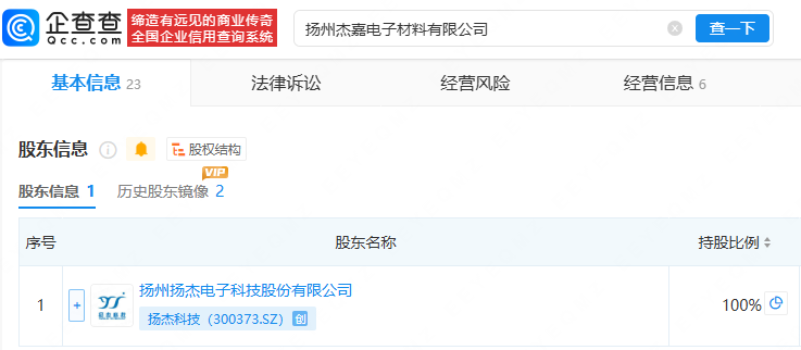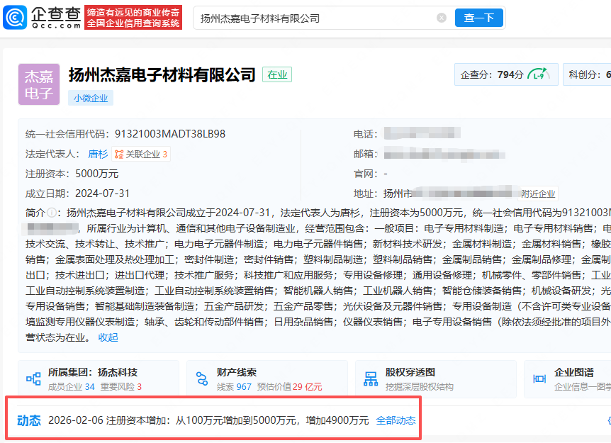 企查查显示,扬州杰嘉电子材料有限公司成立于2024年7月,法定代表人为唐杉,经营范围包含:电子专用材料制造;电子专用材料研发;电力电子元器件制造;新材料技术研发;金属材料制造等,由扬杰科技(300373.SZ)全资持股。