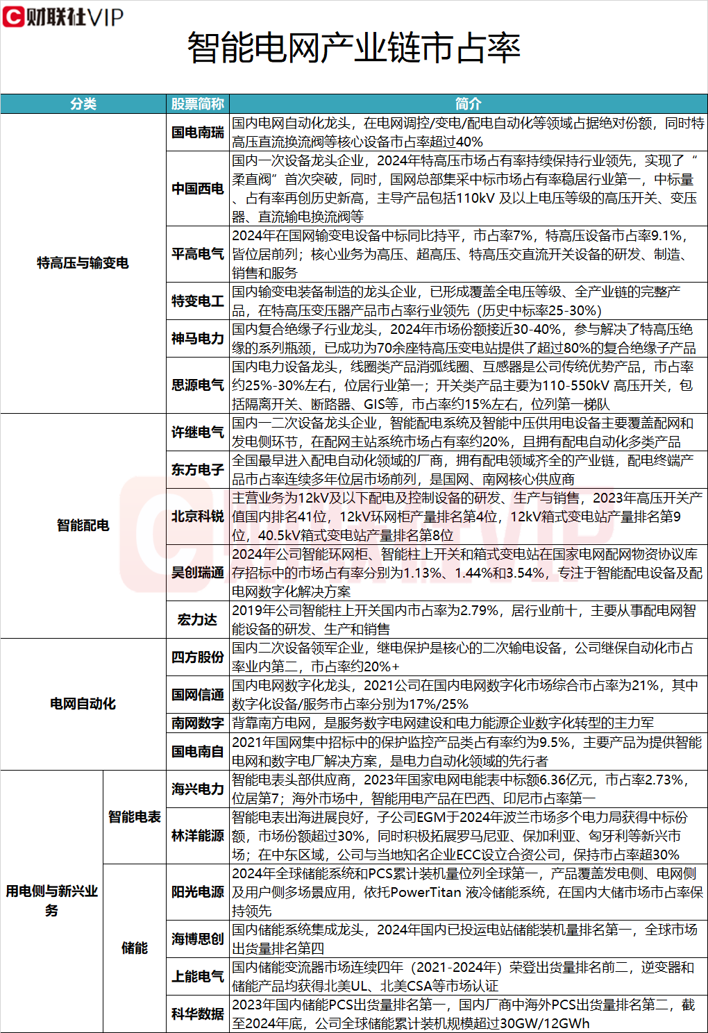 据财联社VIP盘中宝•数据栏目此前梳理,智能电网产业链中,智能配电和电网自动化领域涉及的上市公司包括许继电气、东方电子、北京科锐、昊创瑞通、宏力达、四方股份、国网信通、南网数字和国电南自,具体情况详见下图: