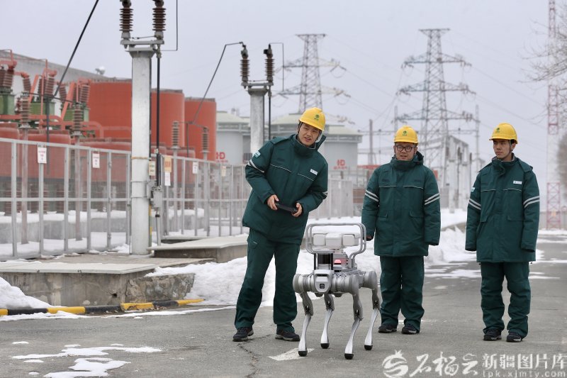 2026年1月,乌鲁木齐220千伏老满城变电站内,国网乌鲁木齐供电公司运维人员和一台智能机器人在对变电设备进行巡检。李瑞摄