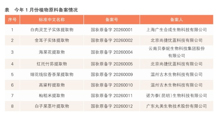综合来看,今年1月份,化妆品新原料备案呈现出“天然资源+生物技术创新+地域特色+功效精准化”的综合发展趋势,我国化妆品原料研发正迈向高质量、差异化、科技驱动新阶段。
