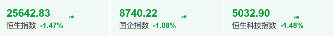 港股三大指数集体低开,恒生指数跌1.82%,恒生科技指数跌2.1%,恒生国企指数跌1.62%。截至发稿,三大指数跌幅有所收窄,但仍超1%。