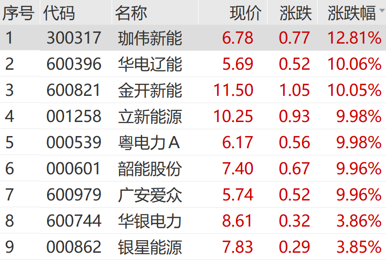 电力板块直线拉升,华电辽能4连板,粤电力A、韶能股份2连板,珈伟新能涨超10%。