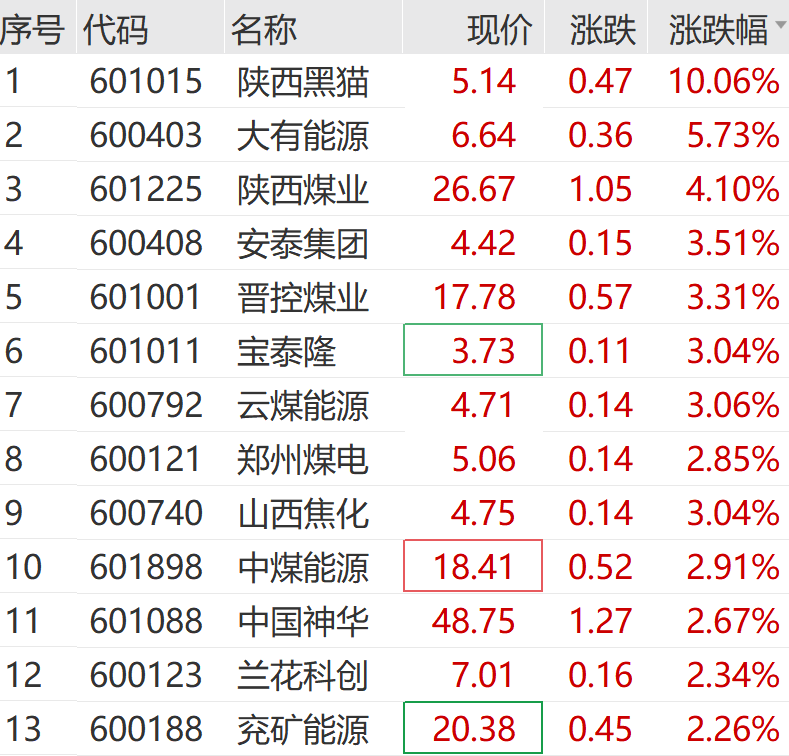 煤炭板块紧跟发力,陕西黑猫大举涨停,大有能源、陕西煤业、安泰集团、中煤能源等跟涨。