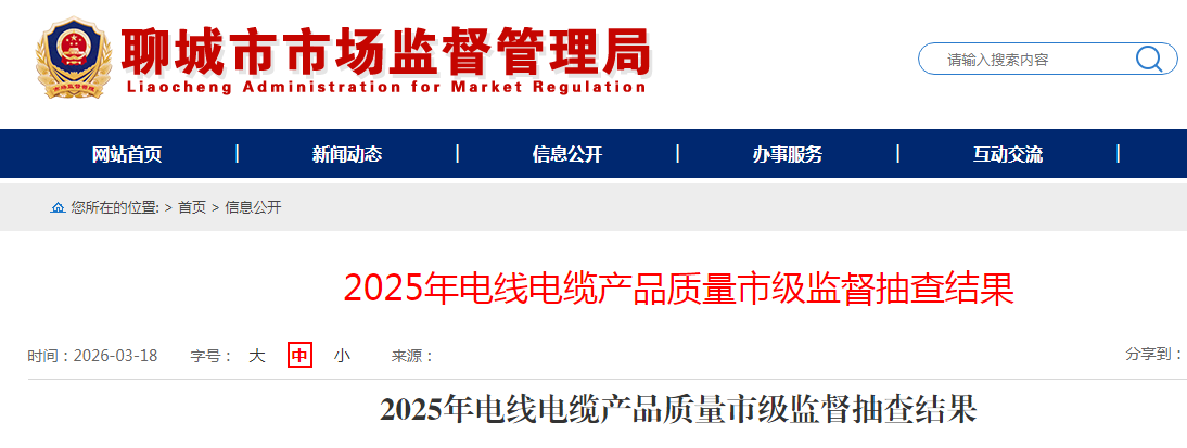 中国质量新闻网讯 据山东省聊城市市场监督管理局网站消息,近日,聊城市市场监督管理局公布2025年电线电缆产品质量市级监督抽查结果。本次共抽查生产领域及流通领域电线电缆产品60批次。