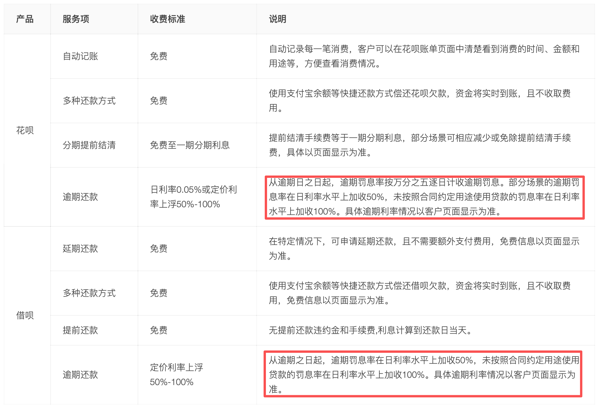 财闻注意到,需关注逾期还款情况下的“罚息”问题。据蚂蚁消金披露的“花呗”产品信息,逾期罚息率按万分之五逐日计收逾期罚息,部分场景的逾期罚息率在日利率水平上加收50%。如果违规使用贷款,罚息率则在日利率上加收100%。