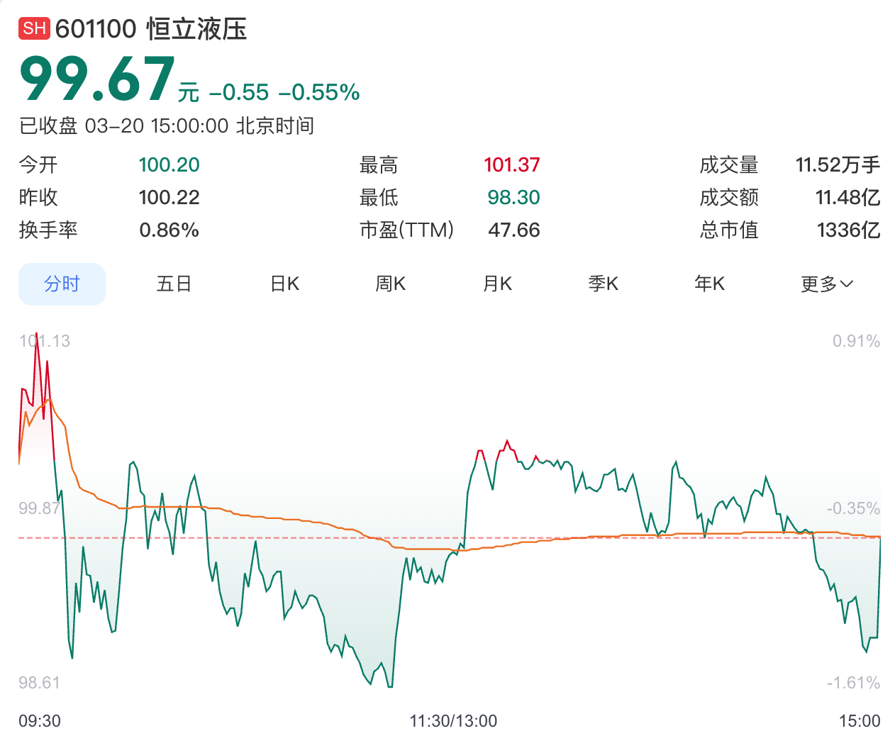 截至3月20日收盘,恒立液压股价跌0.55%,报收99.67元/股,总市值为1336亿元。今年来公司股价累计下跌约9%。