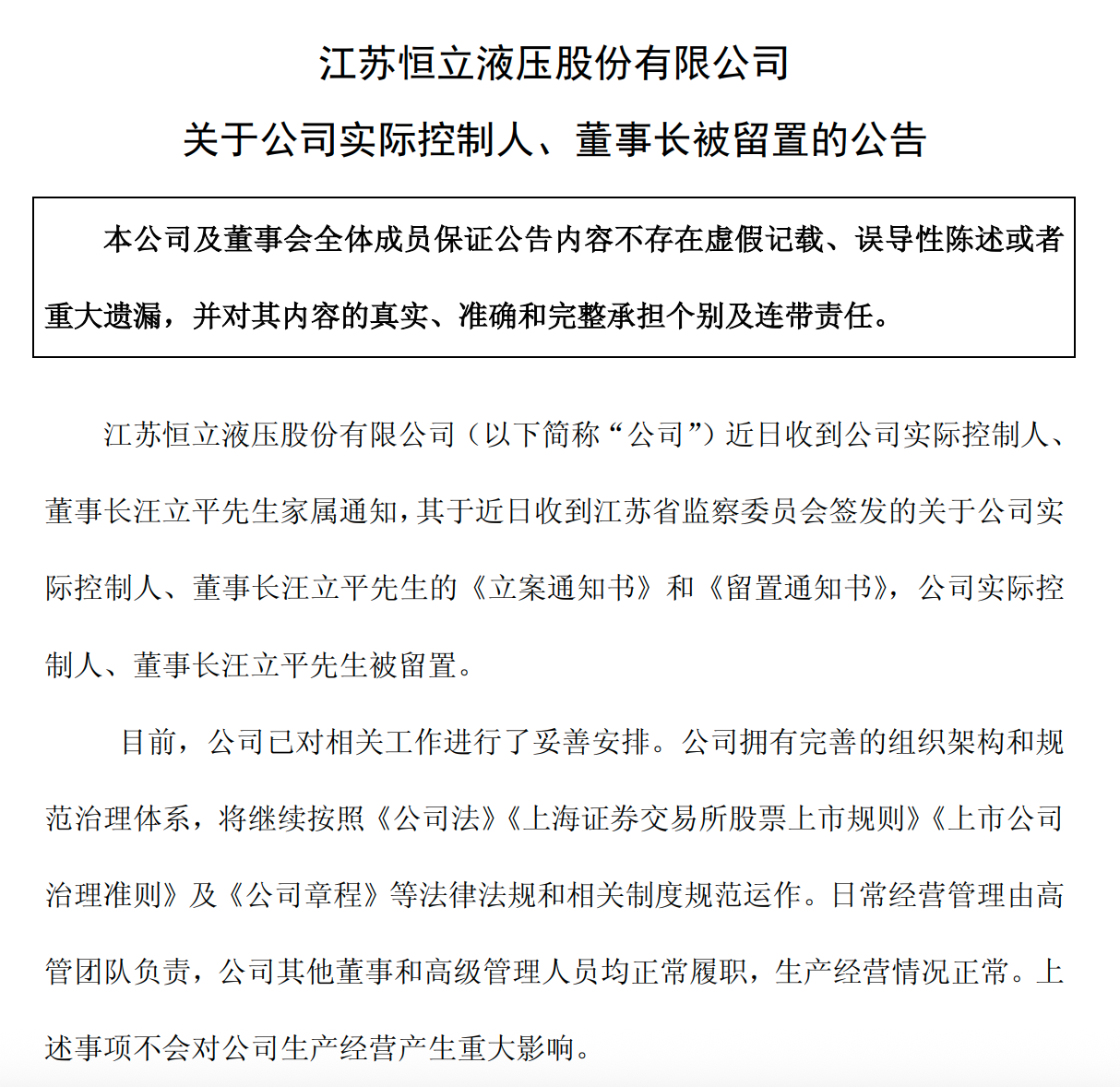 对于汪立平被留置的具体原因,恒立液压并未披露。其表示,目前,公司已对相关工作进行了妥善安排。公司拥有完善的组织架构和规范治理体系,将继续按照《公司法》《上海证券交易所股票上市规则》《上市公司治理准则》及《公司章程》等法律法规和相关制度规范运作。日常经营管理由高管团队负责,公司其他董事和高级管理人员均正常履职,生产经营情况正常。上述事项不会对公司生产经营产生重大影响。