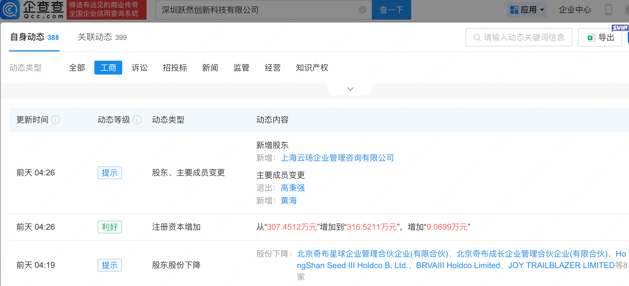 该公司成立于2021年,经营范围包含:货物进出口;软件开发;移动终端设备制造;机械设备研发等。公开信息显示,跃然创新是一家AI玩具公司。