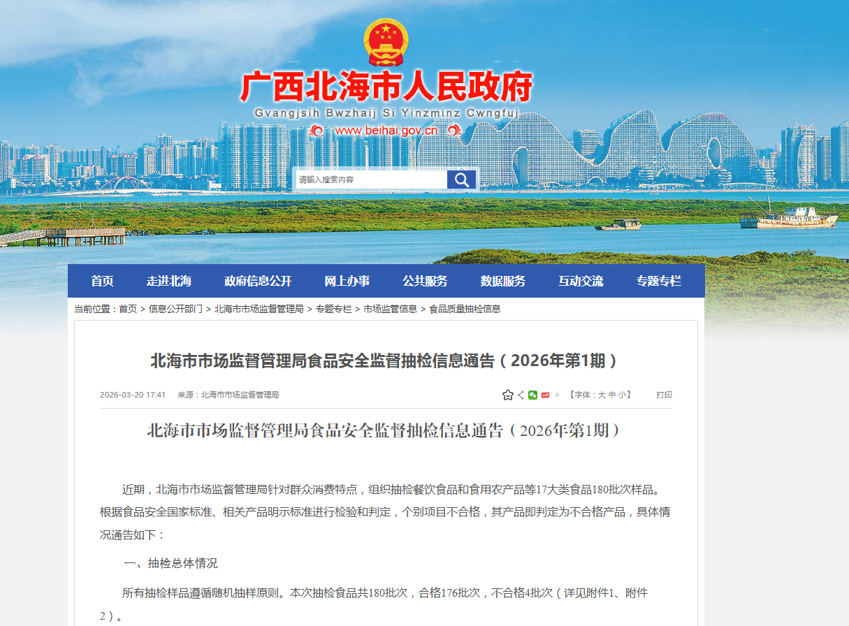近期,北海市市场监督管理局针对群众消费特点,组织抽检餐饮食品和食用农产品等17大类食品180批次样品。根据食品安全国家标准、相关产品明示标准进行检验和判定,个别项目不合格,其产品即判定为不合格产品,具体情况通告如下:
