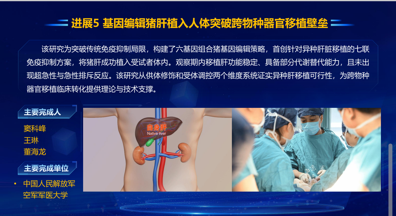 “基因编辑猪肝植入人体突破跨物种器官移植壁垒”主要完成单位为中国人民解放军空军军医大学,主要完成人为窦科峰、王琳、董海龙。该研究为突破传统免疫抑制局限,构建了六基因组合猪基因编辑策略,首创针对异种肝脏移植的七联免疫抑制方案,将猪肝成功植入受试者体内。观察期内移植肝功能稳定、具备部分代谢替代能力,且未出现超急性与急性排斥反应。该研究从供体修饰和受体调控两个维度系统证实异种肝移植可行性,为跨物种器官移植临床转化提供理论与技术支撑。