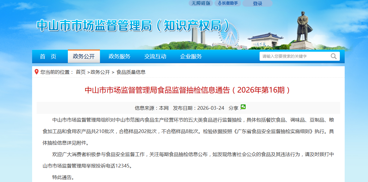 中山市市场监督管理局组织对中山市范围内食品生产经营环节的五大类食品进行监督抽检,具体包括餐饮食品、调味品、豆制品、粮食加工品和食用农产品共210批次,合格样品202批次,不合格样品8批次。检验依据按照《广东省食品安全监督抽检实施细则》执行。具体抽检信息详见附件。