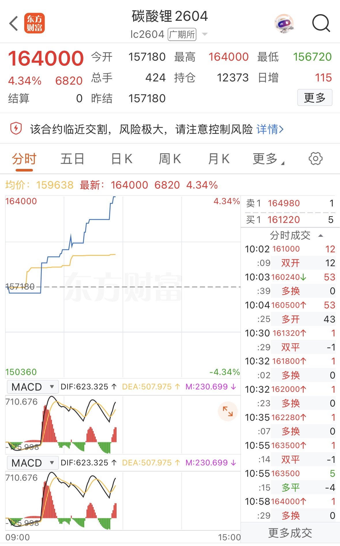 期货市场同步共振,碳酸锂主力合约突破16万元/吨关口,盘中涨幅超4%,期现联动效应凸显。