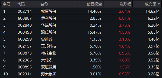 养殖ETF汇添富(159172)标的指数热门成分股多数飘红:华统股份、安迪苏涨超3%,牧原股份涨超2%,温氏股份、正邦科技涨超1%,伊利股份、梅花生物微涨。